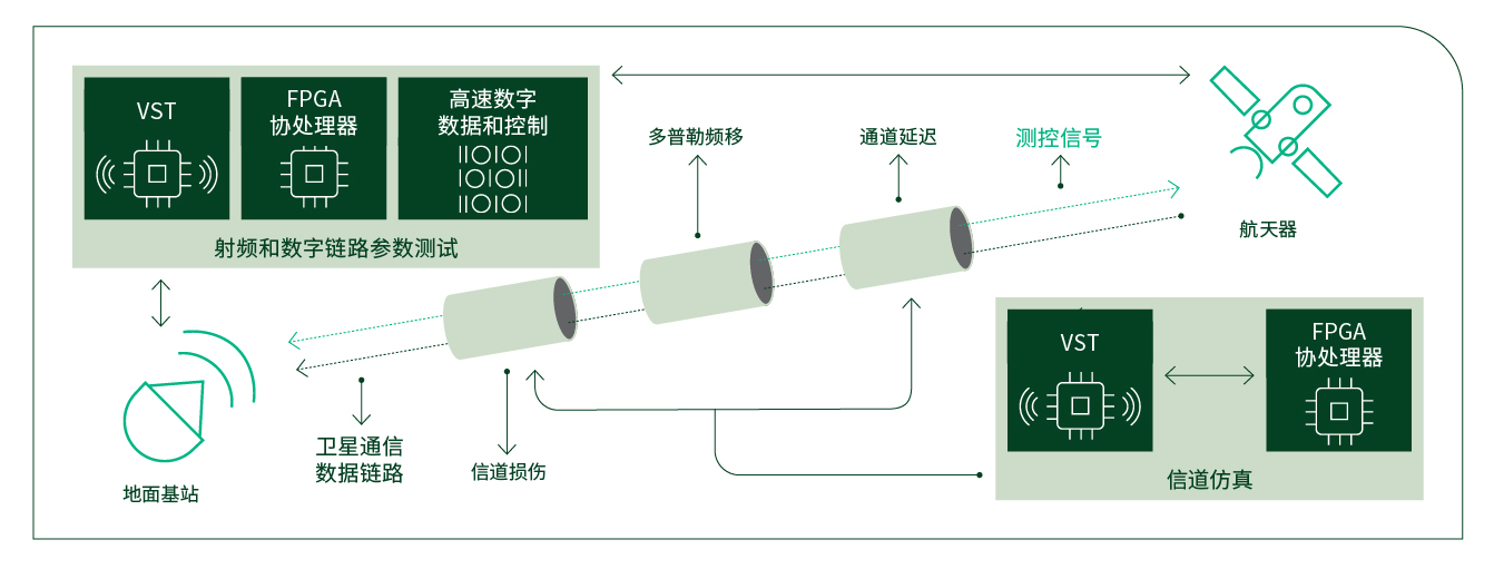 NI矢量信号收发仪(VST)是该解决方案的核心射频技术。VST本身可以发射和接收测控和卫星通信数据链信号,执行关键信号保真度测量,如调制精度、发射功率等。结合PXIe FlexRIO协处理器,VST可以变得更加强大,因为该协处理器具有的开放式FPGA不仅能够进行全速率数据传输,而且能够执行实时在线信号处理以及搭建通道模型。通过对协处理器进行配置,VST可转换为RF通道仿真器,从而能够提供完整的系统级验证能力。