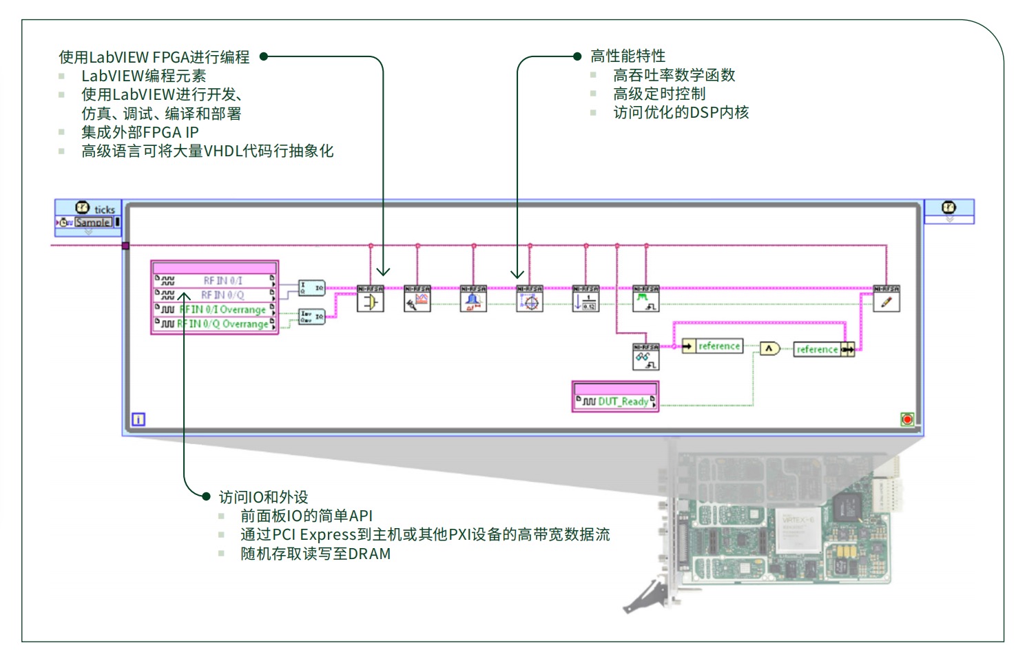 PXI FlexRIO协处理器模块具有高性能FPGA,可为PXI系统增加信号处理能力。这些模块利用Xilinx最新的FPGA芯片、PCI Express等数据流技术以及NI点对点串流技术,通过背板与其他模块进行高带宽数据通信。PXI FlexRIO协处理器模块与PXI矢量信号收发仪等其他PXI设备配合使用,可提供实时运行复杂算法所需的额外FPGA资源。此外,LabVIEW FPGA的组件级IP集成功能可让您轻松导入VHDL或Verilog通道模型算法。